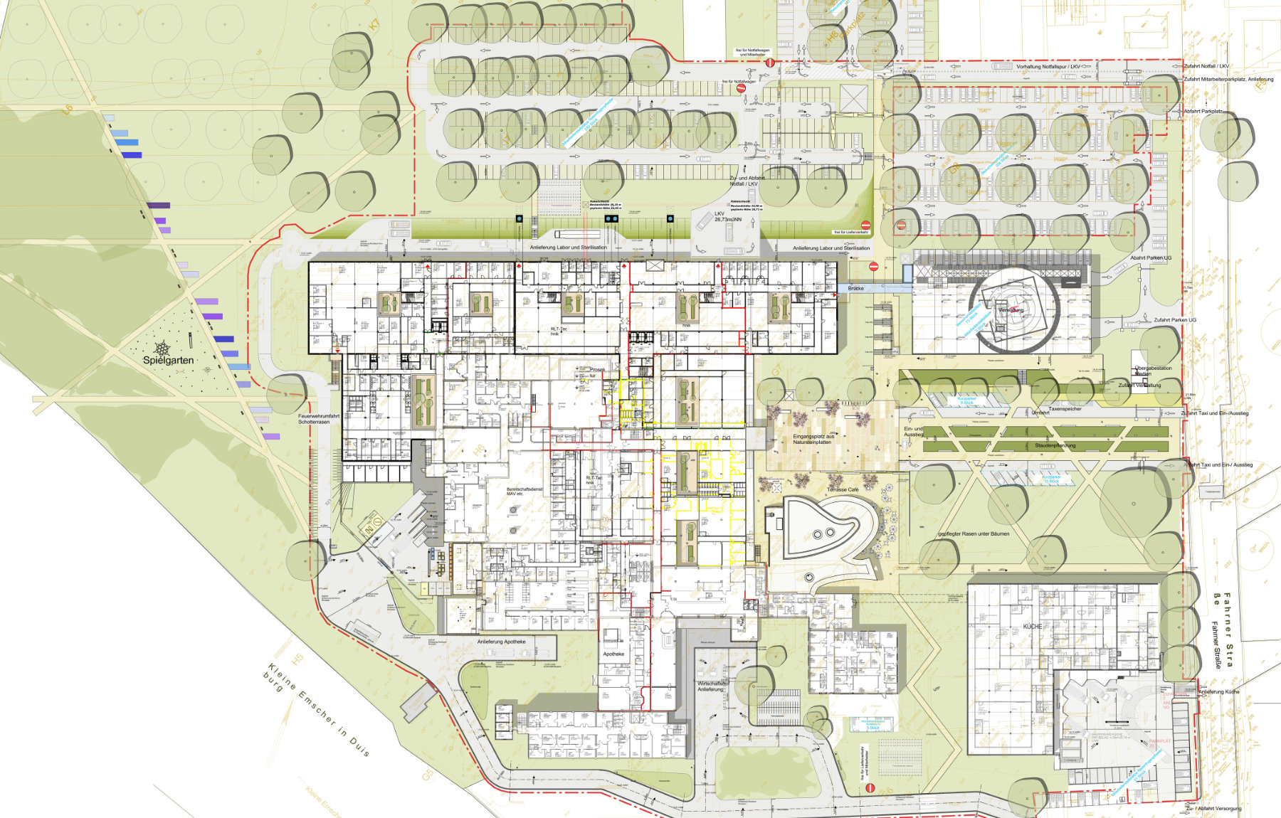 Im Zuge der Zusammenlegung von zwei Kliniken in Duisburg sind umfangreiche Neu- und Umbaumaßnahmen mit einem Gesamtbauvolumen von rd. 150 Mio.€ notwendig geworden. Die Freianlagenplanungen zu diesem Projekt sind äußerst komplex: Durch intelligente Planung können Interimsmaßnahmen vermieden und als Vorabmaßnahmen gebaut werden. So können Baumittel in die Herstellung von gut funktionierenden Wirtschaftshöfen zur Ver- und Entsorgung, einem repräsentativen Eingangsbereich mit einem städtisch wirkenden Platz, durchdachten Verkehrsanlagen für die Anlieferung und Stellplatzanlagen sowie einer kreuzungsfreien Spur für die Liegendkrankenvorfahrt geschaffen werden.