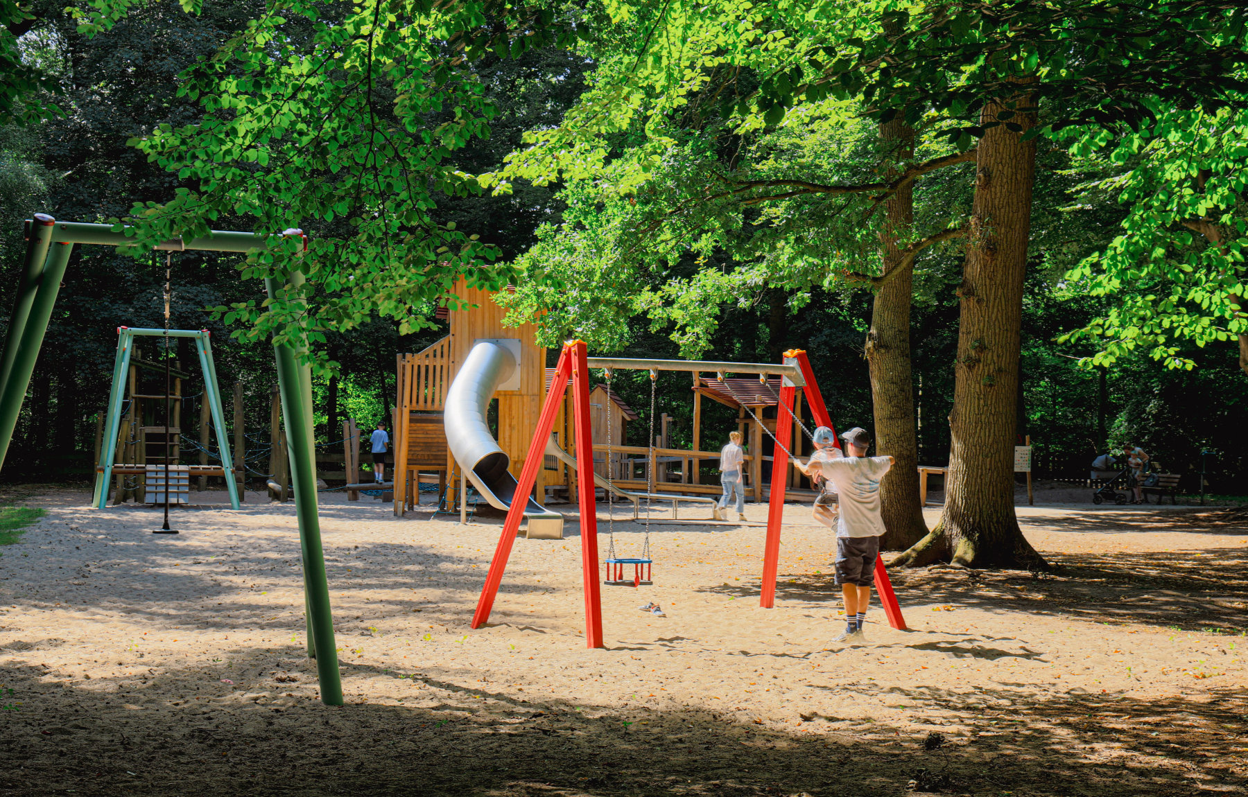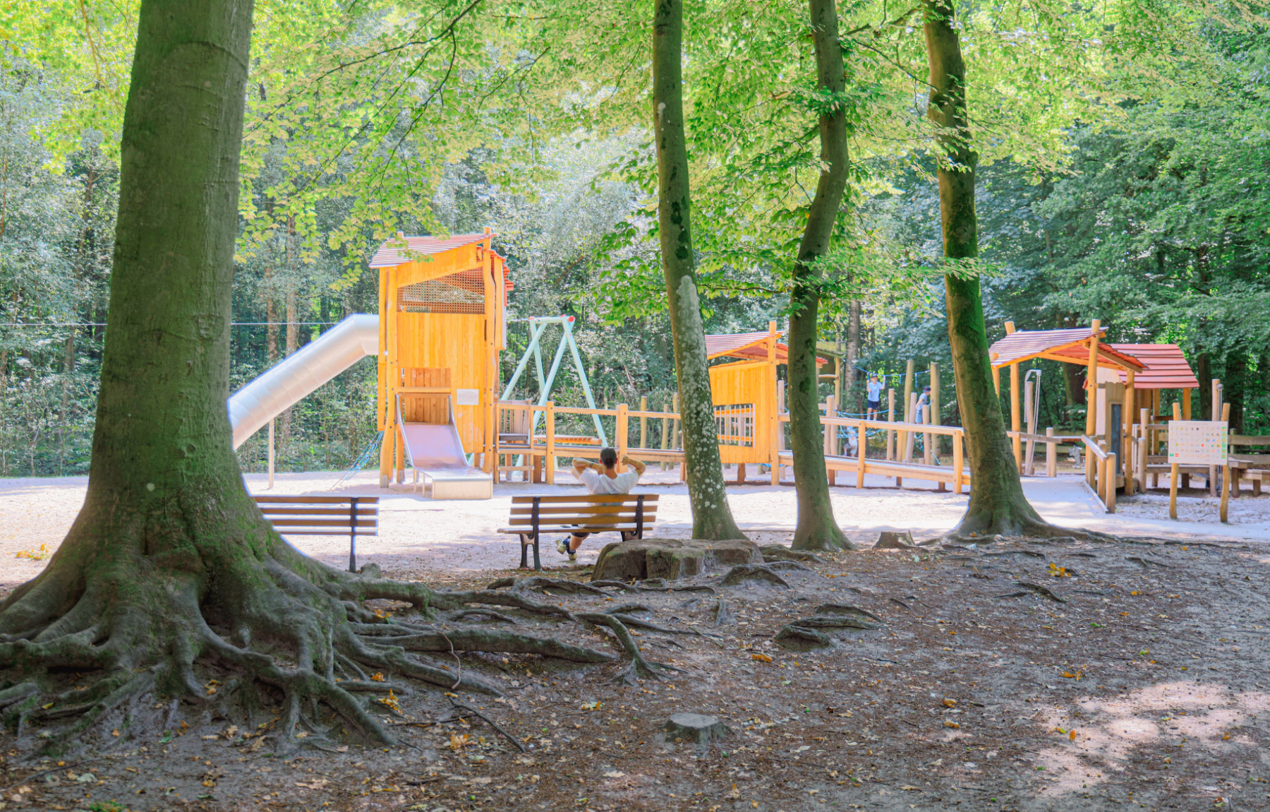 Die Planung hat besonders Rücksicht auf die bestehenden Bäume und deren Wurzelsystem genommen, gleichzeitig ist ein Spielort mit angenehmen Aufenthaltsmöglichkeiten und Spielangeboten, die für alle Kinder nutzbar sind, entstanden.